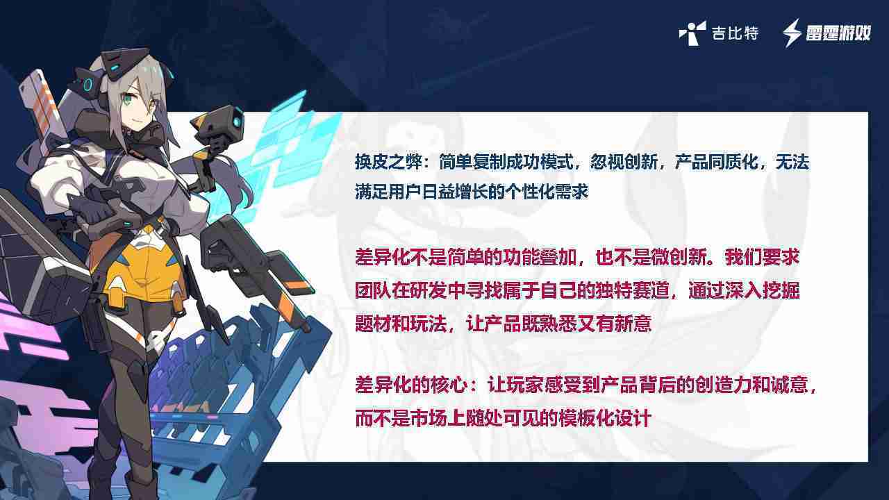 在我们内部是这么定义差异化的。。。首先,,,,差异化不是简单的功能叠加,,,更不是换皮。。。只是换皮,,,产品无法提供有效的市场价值。。内部经常说差异化的产品不是为了迎合市场,,,,而是找到一个自己独特的表达方式,,,在研发中找到属于自己的细分赛道和独特赛道,,前提是需要对这个题材有足够的深入、、挖掘,,对玩法有足够深入的理解,,,,让产品看起来既熟悉又有新意。。。