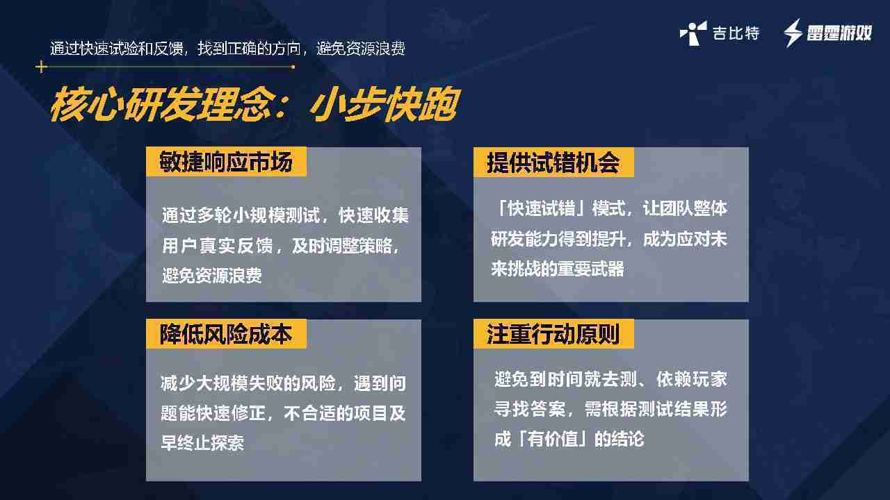 小步快跑不是找答案,,而是验证答案。。。。我们之前有项目是这样的,,有些制作人会有几个方向觉得都可以做,,但是不确定做哪一个,,,会选择几个都做,,做完拿到市场跑,,跑出哪一个更好,,,,基于这个再做后续的研发和拓展。。。但这种情况最容易出现一个问题,,,,可能被玩家裹胁,,,玩家说这个点不错、、那个点不错,,,,到底听还是不听,,,不听感觉是无视玩家的反馈,,,听的话,,可能自己没想清楚导致研发思路发生偏颇。。。。所以针对这一点后面自己复盘整理,,发现制作人自己心里要有数,,要做自己觉得好玩的,,,而且明确知道这个东西是你想做的,,,,然后拿到市场验证这个答案是不是对的,,而不是拿一堆答案找哪一个答案更好。。