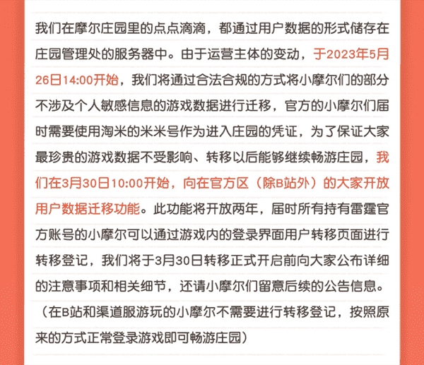 合作结束本就是开发方和代理方双方的事情,,,,降低这件事情对玩家的影响,,,才是对所有珍视这段童年的摩尔玩家最好的呵护。。目前看来,,,,用户完全不用担心后续因无法登录游戏而造成任何数据上的损失,,只要及时进行账号转移,,,,就可以好好保留、、、延续在庄园的痕迹和回忆,,,,继续在庄园里做快乐的红鼻子小鼹鼠。。。
