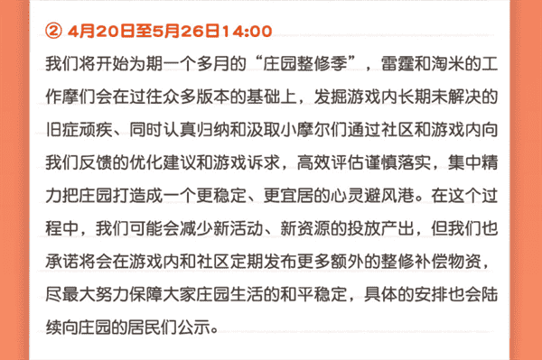 合作的结束并不意味着这个童年IP的结束,,对于《摩尔庄园》手游而言,,这是一个新阶段的开始。。后续游戏内将开启庄园重构计划,,会就以往遗留下来的BUG进行集中修复,,,,并在游戏内和社区定期发布更多补偿物资。。。