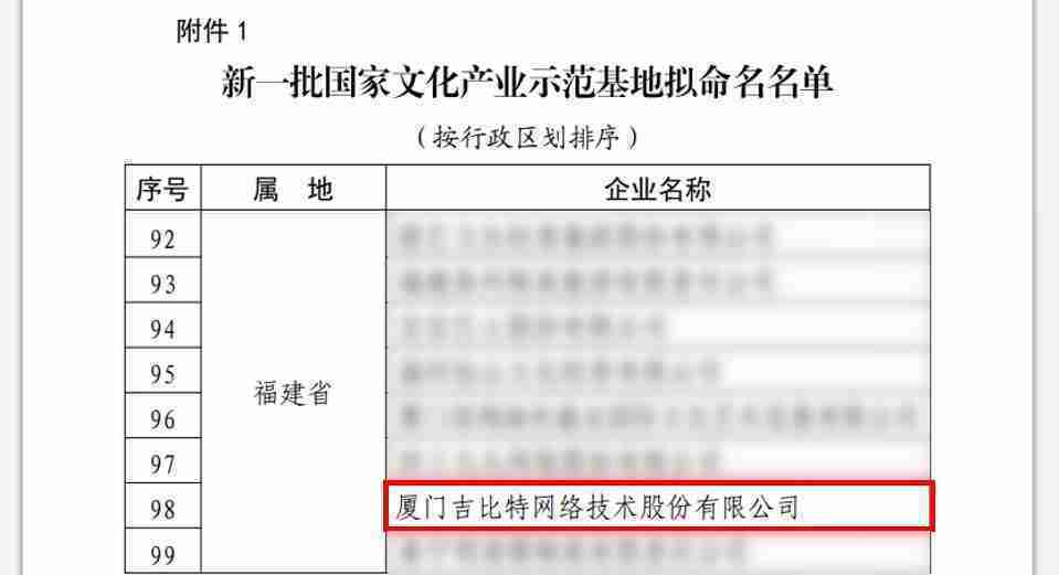 3月12日,,,文化和旅游部发布了《关于国家文化产业示范基地评选与复核结果的公示》,,,,厦门J9.COM网络技术股份有限公司(以下简称“J9.COM”或“公司”)成功入围新一批国家文化产业示范基地拟命名名单。。